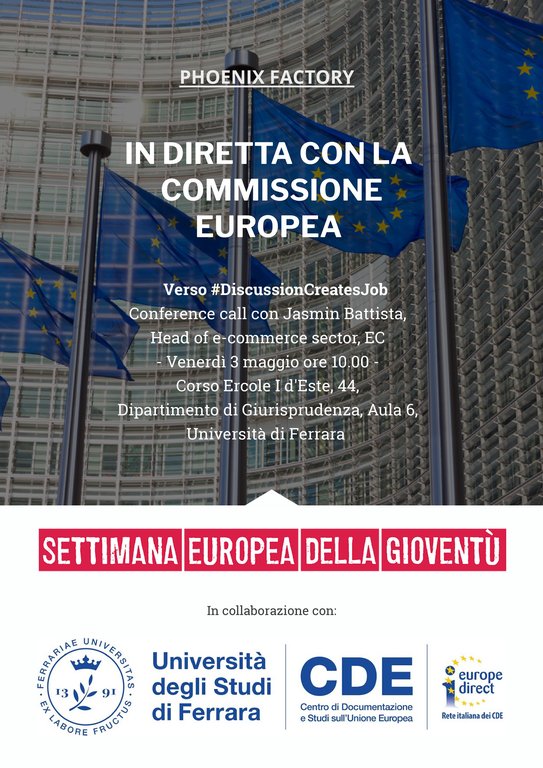 L'associazione studentesca Phoenix Factory, in collaborazione con il CDE Unife, ha organizzato per il 3 maggio 2019 presso l'aula 6 del Dipartimento di Giurisprudenza dell'Università di Ferrara, alle ore 10.00, una Conference call con Jasmin Battista, Head of e-commerce sector, European Commission per discutere delle opportunità che l'UE offre per la qualificazione professionale dei giovani e il loro inserimento lavorativo.
