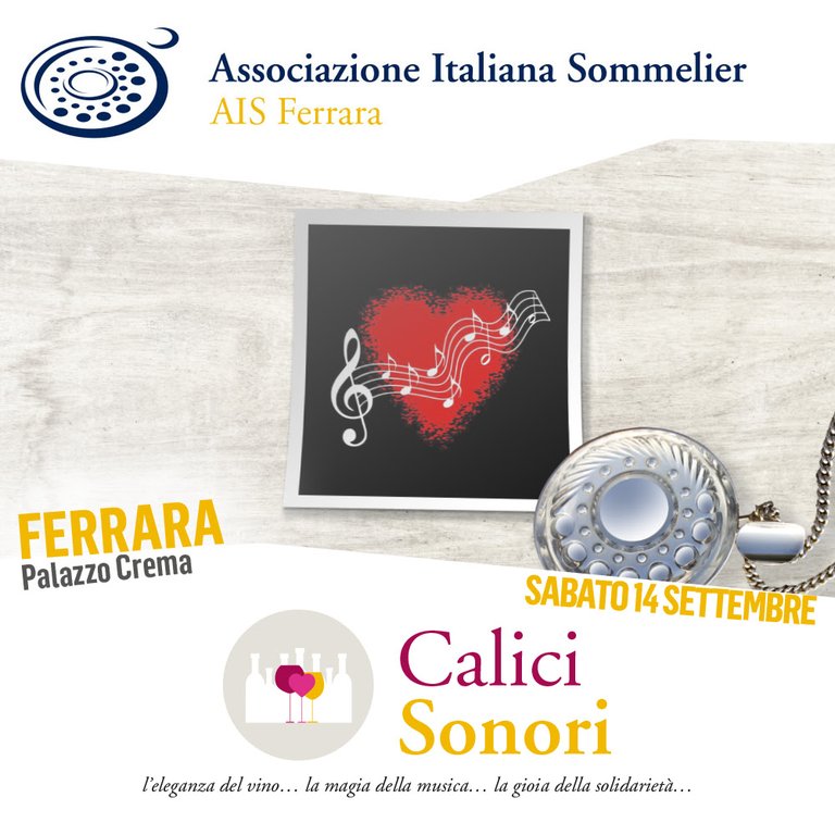 Nello splendido scenario di Palazzo Crema, il gruppo “Night Mood Trio” vi condurrà, fra bossanova e smooth jazz, in un percorso musicale dagli anni ’30 a oggi, colorando una serata nella quale si potranno degustare, presso il banco assaggio curato dalla Delegazione AIS Ferrara, una selezione di bollicine emiliane.