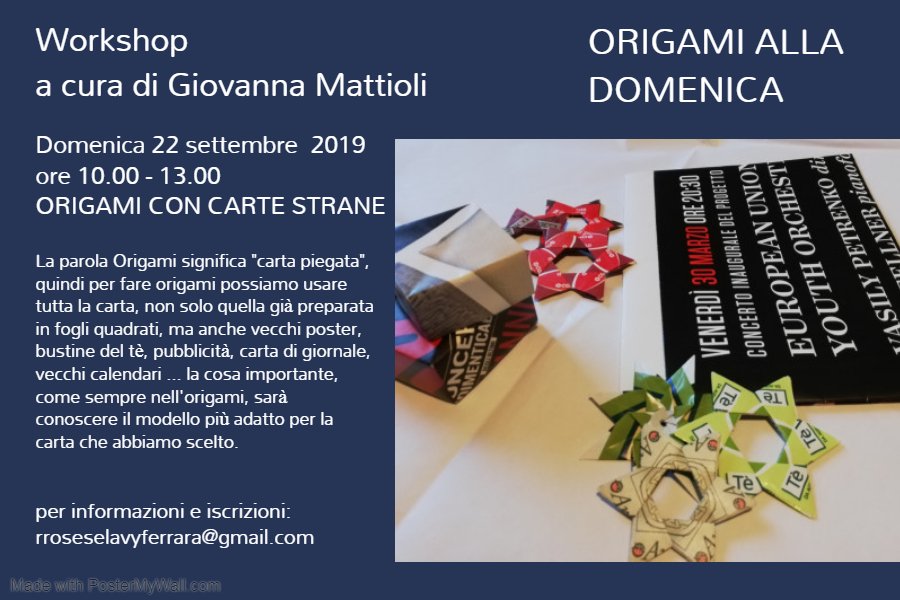 Il laboratorio sarà tenuto da Giovanna Mattioli (architetto, giardiniera,origamista) presso la sede dell'associazione Rrose Sélavy in via Ripagrande 46 a Ferrara.