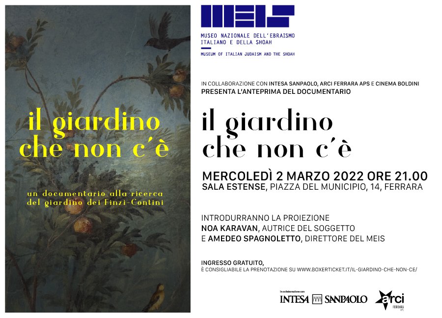 Il 2 marzo alle 21.00 il MEIS, in collaborazione con Intesa Sanpaolo, Arci Ferrara APS e il Cinema Boldini, presenta l'anteprima ferrarese del documentario "Il Giardino che non c'è" diretto da Rä di Martino e dedicato a Giorgio Bassani e alla sua indimenticabile opera "Il giardino dei Finzi-Contini".