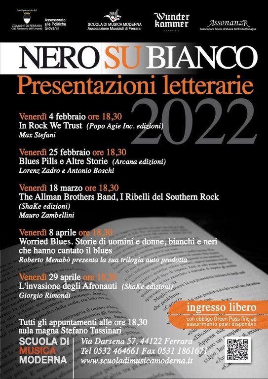 Venerdì 25 febbraio ore 18,30 presso Aula Magna Stefano Tassinari della Scuola di Musica Moderna in via Darsena 57 – Ferrara, Lorenz Zadro presenta il suo ultimo libro “Blues Pills e altre storie” edito da Arcana per la rassegna Nero su Bianco arrivata alla terza edizione, nata nel 2019 per coronare la pubblicazione di “Storie di Standard” (AMF) di Giorgio Rimondi e Massimo Mantovani, continua la sua mission di presentazioni letterarie legate al mondo musicale.