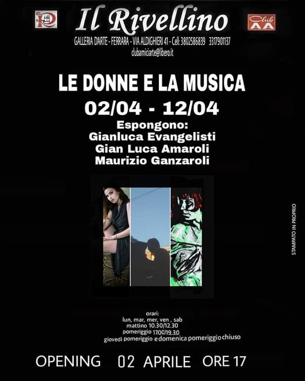 A seguire la Rassegna di Fotografia e Pittura “Le Donne e la Musica” di Gianluca Evangelisti, Maurizio Ganzaroli e Gian Luca Amaroli, che s'inaugura Sabato 02 Aprile alle 17 alla Galleria d'arte "il Rivellino" di via Aldighieri. Una mostra che mette a confronto due discipline espressivo-visive divenute, nel tempo, tradizionali e innovative nel quadro dell’arte.