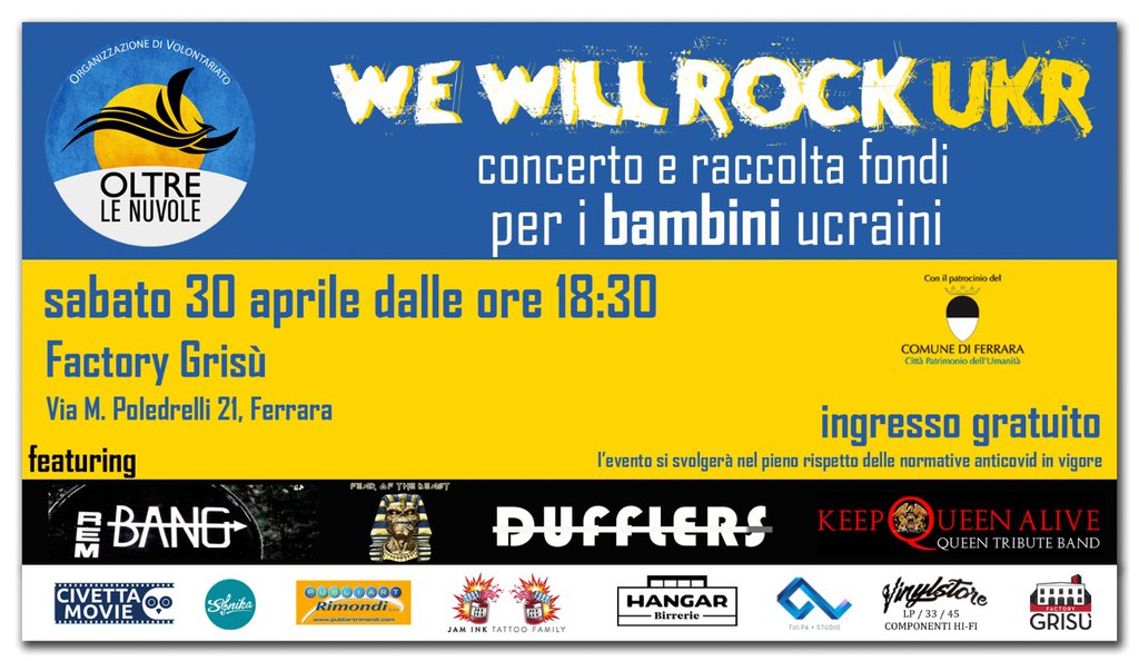 Sabato 30 aprile alle 18,30 presso lo spazio del consorzio Grisù in via Polendrelli a Ferrara avrà luogo il concerto “WE WILL ROCK UKR” al quale parteciperanno quattro gruppi musicali rock ferraresi che si alterneranno durante la serata sul palco dell’ampio giardino dell’ex caserma dei Vigili del Fuoco. Cinque ore di musica rock per dire No alla guerra in Ucraina e per raccogliere fondi da destinare a progetti per i bambini ucraini rifugiati e accolti nel territorio ferrarese.