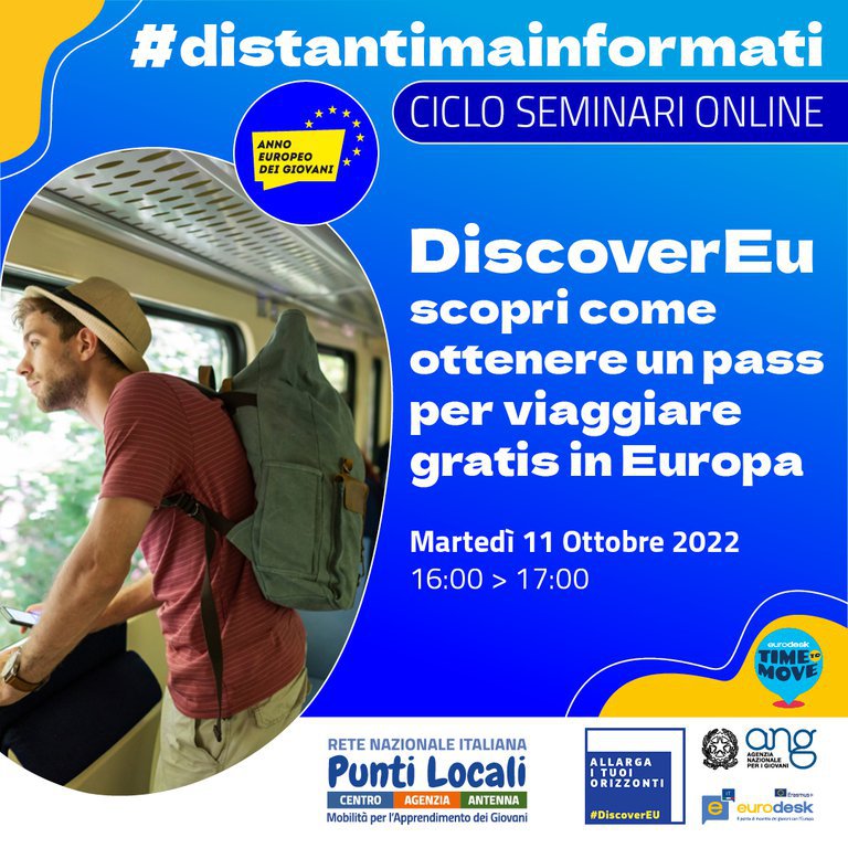 Il prossimo webinar, dal titolo “DiscoverEu –scopri come ottenere un pass per viaggiare gratis in Europa” si terrà Martedì 11 Ottobre 2022 dalle ore 16:00 alle 17:00.