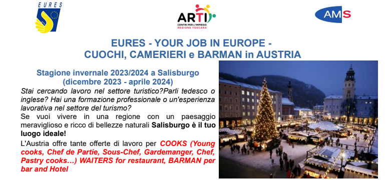 Il giorno 11 ottobre alle ore 15:30 presso il Centro Impiego id Pistoia si terrà un Recruitment Day per la Stagione invernale 2023/2024 a Salisburgo (dicembre 2023 - aprile 2024) profili: CUOCO-CAMERIERE-BARMAN.