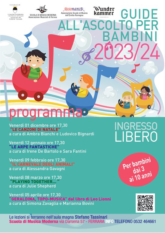 Per il ciclo di appuntamenti ad ingresso libero di Guida all'ascolto per bambini dai 3 ai 10 anni organizzati dalla Scuola di Musica Moderna – Associazione Musicisti di Ferrara APS in collaborazione con il Consorzio Wunderkammer, con il patrocinio e il contributo del Comune di Ferrara.