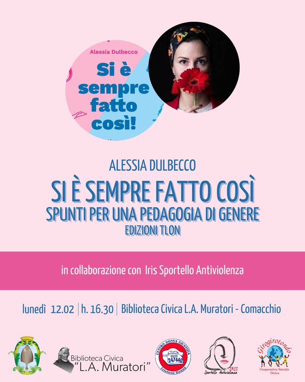 si terrà lunedì 12 febbraio alle ore 16.30 presso la Biblioteca Civica L.A. Muratori in Via Agatopisto 5 Comacchio, la Presentazione del libro "Si è sempre fatto così. Spunti per una pedagogia di genere" presso la Biblioteca Civica L.A. Muratori in Via Agatopisto 5 Comacchio. Sarà presente l'autrice, evento realizzato dallo Sportello Antiviolenza Iris grazie al Comune di Comacchio, Cooperativa Sociale Girogirotondo in collaborazione con la Biblioteca L.A.Muratori e il Centro Donna Giustizia.