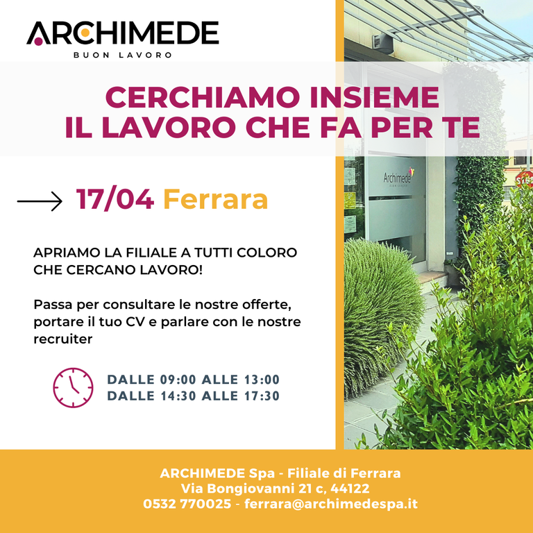 Se non hai un’occupazione lavorativa e sei alla ricerca della posizione più adatta a te, contattaci all’indirizzo email: ferrara@archimedespa.it.