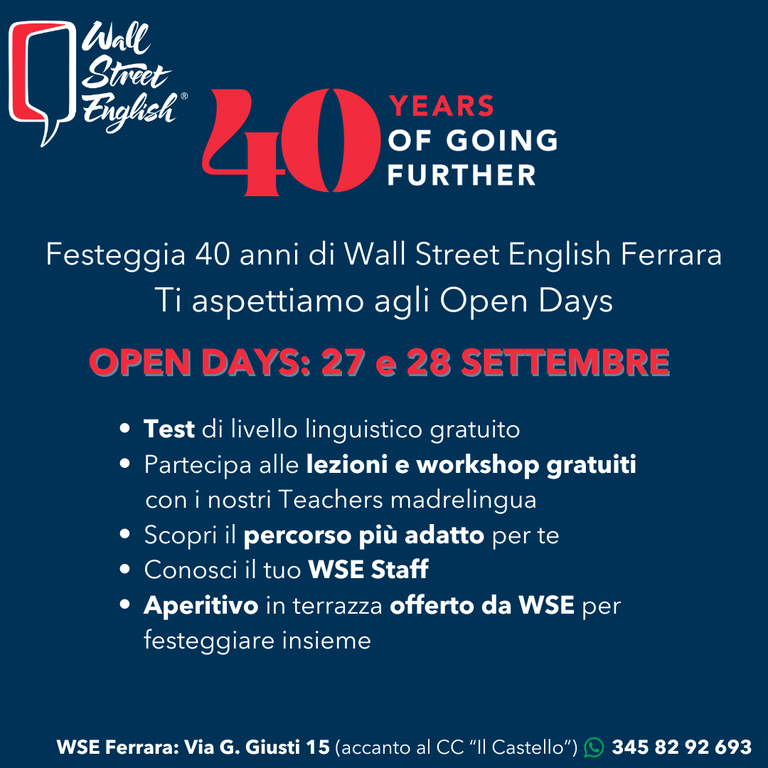 Wall Street English Ferrara compie 40 anni e apre le porte della scuola con delle giornate e degli eventi speciali dedicati all’Inglese!