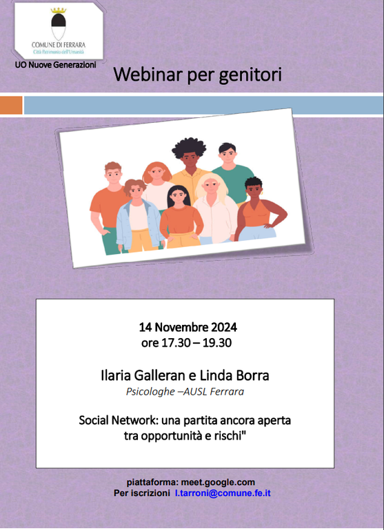 Dove sei: Homepage > Formazione > Notizie Formazione > Webinar per genitori "Social Network: una partita ancora aperta tra opportunità e rischi" - giovedì 14 novembre 2024 dalle 17.30 alle 19.30