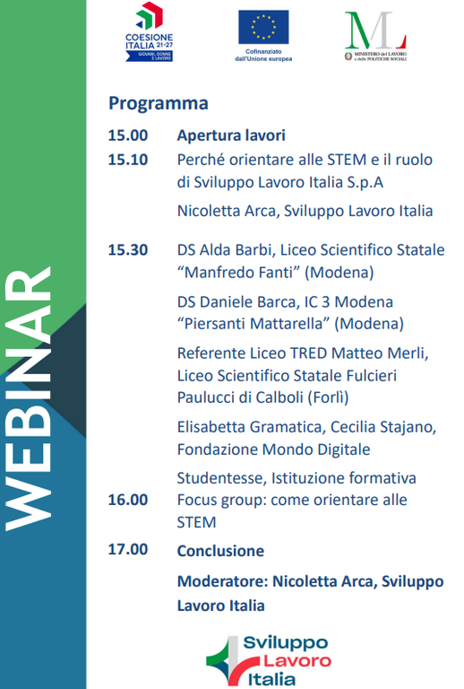 Webinar “Come Orientare alle discipline STEM”, organizzato da Sviluppo Lavoro Italia S.p.A. in occasione del Festival della Cultura Tecnica – Undicesima edizione, e che si terrà online il 10 dicembre 2024 dalle 15.00 alle 17.00.