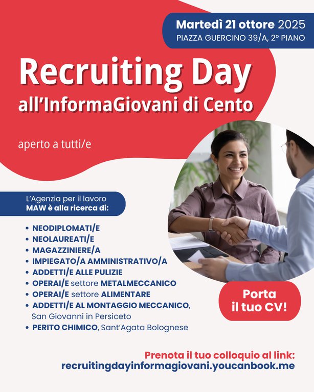 Il primo appuntamento sarà con l'Agenzia MAW, martedì 21 ottobre al pomeriggio; è possibile prenotarsi da qui: https://recruitingdayinformagiovani.youcanbook.me/
