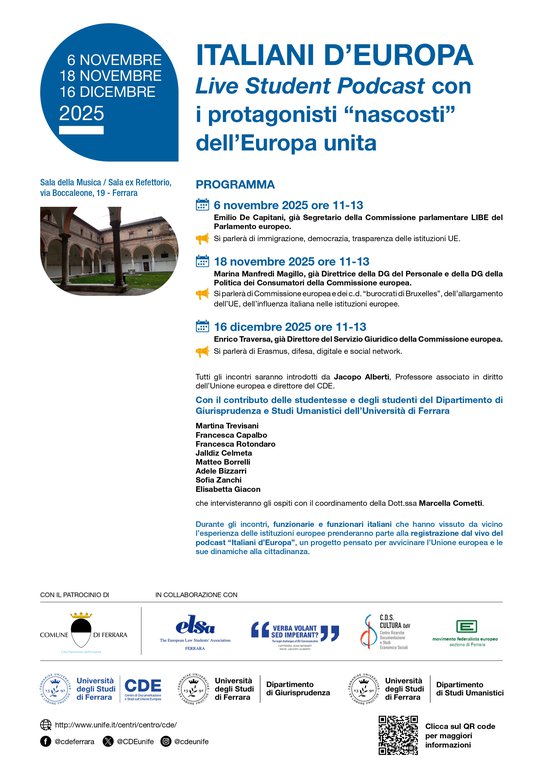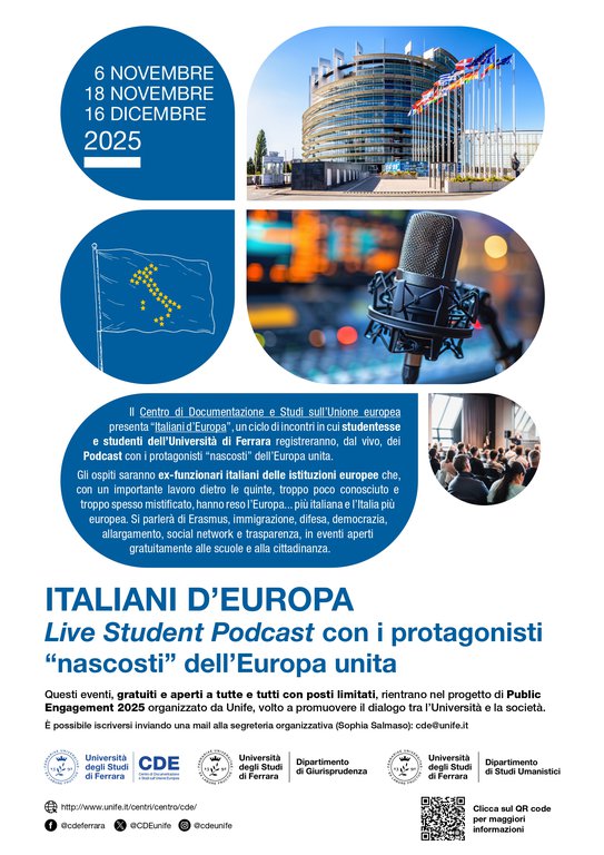 Il Centro di Documentazione e Studi sull'Unione europea presenta "Italiani d'Europa", un ciclo di incontri in cui studentesse e studenti dell’Università di Ferrara registreranno, dal vivo, dei Podcast con i protagonisti “nascosti” dell’Europa unita.