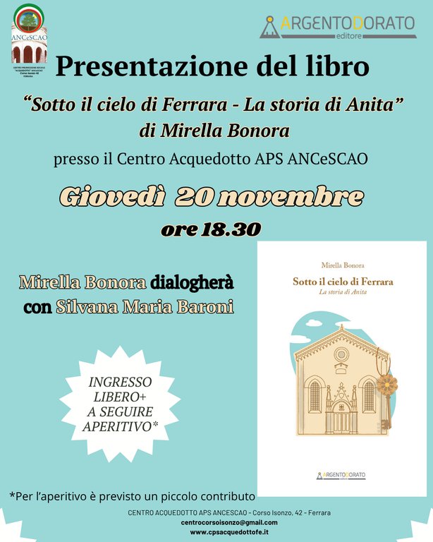 Al Centro Acquedotto APS ANCeSCAO in Corso Isonzo 42 giovedì 20 novembre alle 18.30 verrà presentato l'ultimo libro di Mirella Bonora, "Sotto il cielo di Ferrara - La storia di Anita", la quale dialogherà con Silvana Maria Baroni.