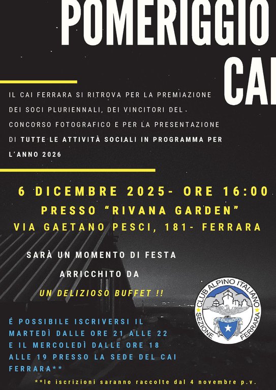 Anche quest'anno ci ritroveremo per la premiazione dei soci pluriennali, dei vincitori del concorso fotografico e per la presentazione di tutte le attività sociali in programma per l'anno 2026.