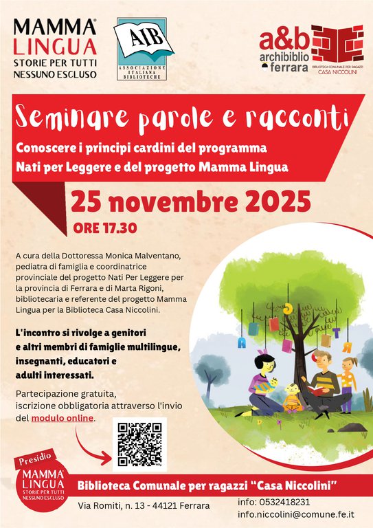 A cura della Dott.ssa Monica Malventano, pediatra di famiglia e coordinatrice provinciale del progetto "Nati Per Leggere" per la provincia di Ferrara e di Marta Rigoni, bibliotecaria e referente del progetto Mamma Lingua per la Biblioteca Casa Niccolini.