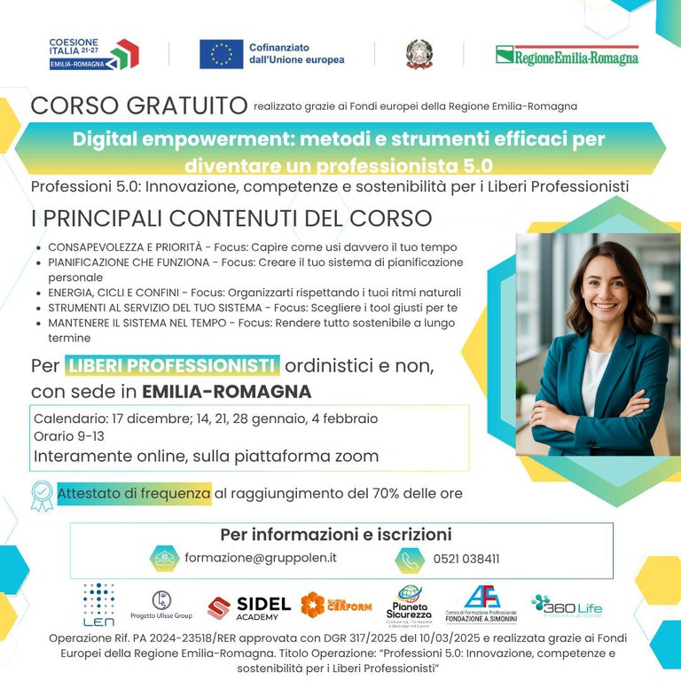È un corso gratuito rivolto ai liberi professionisti dell’Emilia-Romagna, con l’obiettivo di fornire competenze e strumenti pratici per lavorare in modo più organizzato, consapevole e sostenibile. Nel corso delle 20 ore di formazione online, i partecipanti impareranno a: