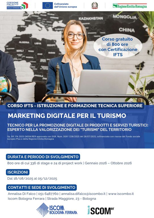 Descrizione del profilo: Il "Tecnico per la promozione di prodotti e servizi turistici con attenzione alle risorse, opportunità ed eventi del territorio" promuove e valorizza il territorio, attraverso l'analisi delle risorse, la progettazione di pacchetti turistici, comunicazione e marketing, innovativi e sostenibili, in coerenza con i fabbisogni espressi dal tessuto imprenditoriale bolognese, che richiede figure tecniche in grado di rafforzare la competitività territoriale e ampliare i pubblici di riferimento. Il corso forma un profilo ibrido, flessibile e competente, in grado di operare in contesti diversi e contribuendo alla crescita qualitativa del sistema turistico locale.
