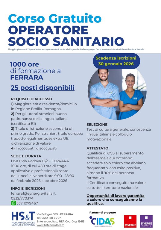 Synergie Italia Agenzia per il Lavoro organizza un CORSO GRATUITO per acquisire la qualifica di OPERATORE SOCIO-SANITARIO, con reale prospettiva di assunzione al termine della formazione.