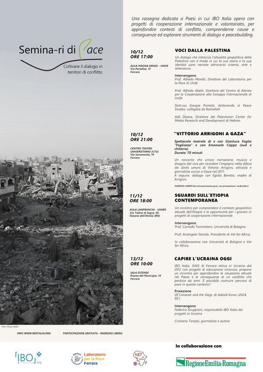 “Semina-ri di Pace: coltivare il dialogo in territori di conflitto” è una rassegna di incontri organizzati da IBO Italia aperti alla cittadinanza per guardare da vicino alcuni contesti dove IBO è presente con progetti di cooperazione e volontariato: Palestina, Etiopia, Ucraina, insieme a docenti universitari, attiviste/i, giornaliste/i e testimoni diretti, attraverso racconti, cinema, teatro e momenti di dialogo con il pubblico.