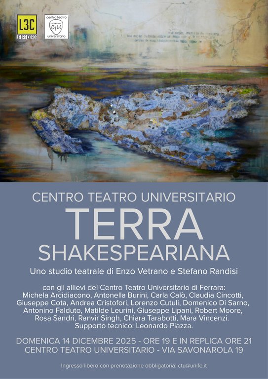 Domenica 14 dicembre, alle ore 19:00 e in replica alle ore 21:00, presso il Centro Teatro Universitario andrà in scena Terra Shakespeariana, esito di un percorso laboratoriale sui