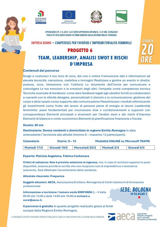 IMPRESA DONNA – Competenze per favorire l’imprenditorialità femminile - Progetto 6 “Team, leadership analisi SWOT e rischi d’impresa”, 20 ore