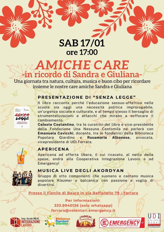 Biblioteca Popolare Giardino, Emergency, Coop Integrazione Lavoro, il Fienile di Baura e UDI invitano all’ evento in ricordo di Sandra e Giuliana, due amiche care il cui impegno e la cui passione hanno lasciato un segno tangibile.