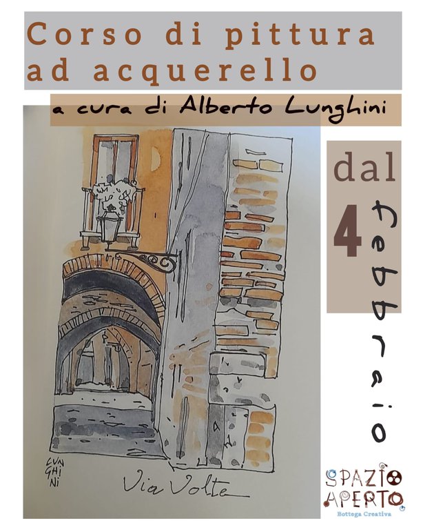 L'associazione di promozione sociale Spazio Aperto Ferrara organizza nei propri spazi di via Carlo Mayr 69 Ferrara un corso di pittura ad acquarello a cura del maestro Alberto Lunghini. Il corso è suddiviso in più incontri (minimo 3) per la durata di 3 ore ciascuno tutti i mercoledì pomeriggio a partire dal 4 febbraio dalle 18.00 alle 21.00.