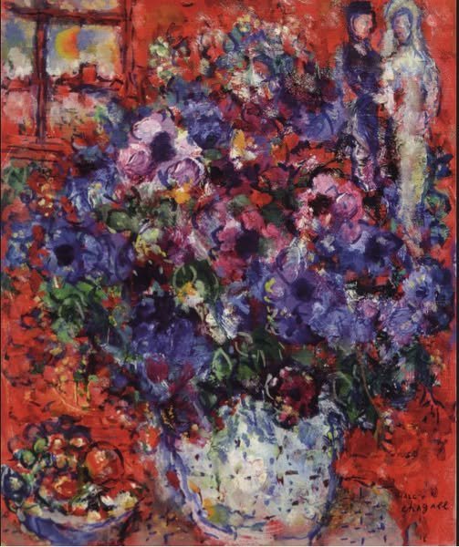 spiritualità e speranza. Chagall ha sempre mantenuto un legame profondo con le immagini della sua infanzia e con la dimensione interiore dell’esistenza. Nelle sue tele, i fiori si fondono spesso con figure umane, animali e architetture fluttuanti, contribuendo a quell’atmosfera onirica che rende immediatamente riconoscibile il suo stile. Influenzato dall’espressionismo, dal