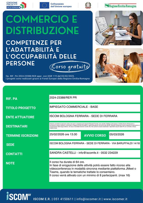 I destinatari dell’ opportunità formativa proposta sono persone residenti in Emilia – Romagna in data antecedente l’iscrizione alle attività, che hanno assolto l’obbligo d'istruzione e il diritto-dovere all'istruzione e formazione e che, indipendentemente dalla condizione occupazionale nel mercato del lavoro, necessitano di azioni formative per acquisire conoscenze e competenze necessarie a rafforzare la propria occupabilità e adattabilità a fronte dei processi di transizione del settore produttivo del commercio e della distribuzione.