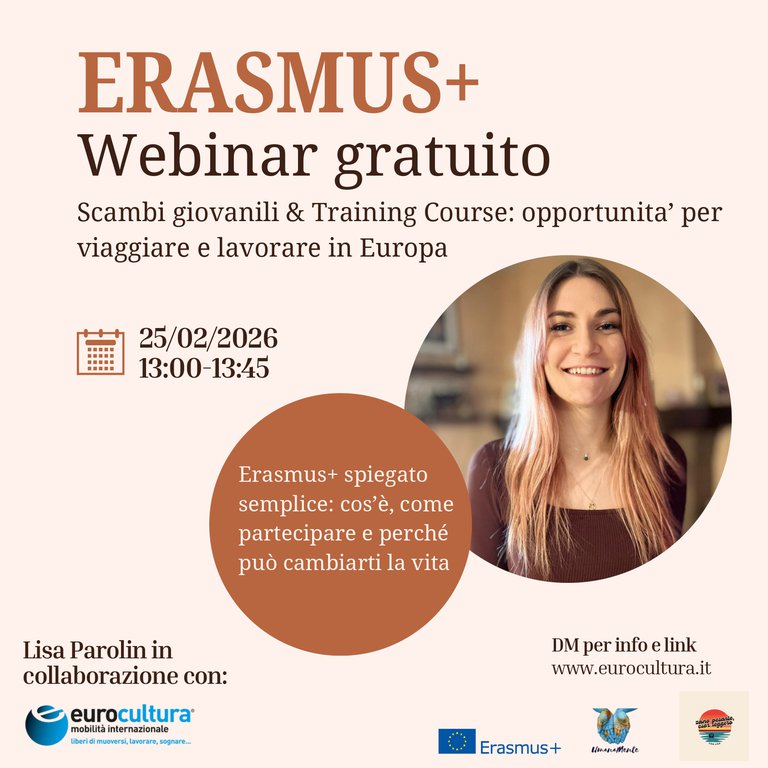 Segnaliamo un webinar gratuito online dedicato a Erasmus+ – Scambi giovanili e Training Courses, pensato per giovani che desiderano fare un’esperienza europea di breve durata, accessibile e finanziata.