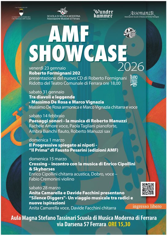 Per il ventitreesimo anno consecutivo, allo scopo di promuovere la cultura e l’educazione musicale in tutte le sue forme moderne, l’Associazione Musicisti di Ferrara APS - Scuola di Musica Moderna, in collaborazione con il Comune di Ferrara, Assessorato alla Cultura, organizza per l'anno scolastico 2025-2026 una serie di appuntamenti nell’aula magna “Stefano Tassinari” della Scuola di Musica Moderna di Ferrara in via Darsena 57.