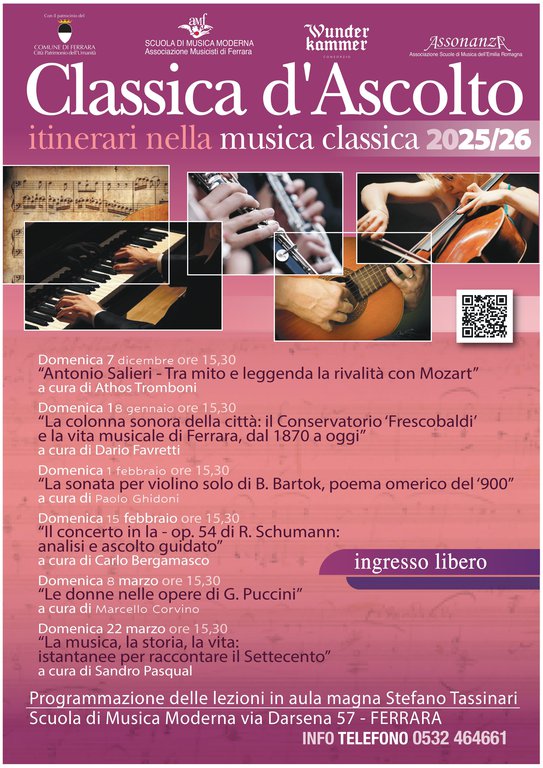 Anche quest’anno, l’Associazione Musicisti di Ferrara APS propone una nutrita serie di appuntamenti ad ingresso libero dedicati alla cultura della musica: Guida all'Ascolto, e Classica d'Ascolto il sabato e la domenica alle ore 15,30 e le Guide all'Ascolto per bambini il venerdì alle ore 17,30 e AMF Showcase.