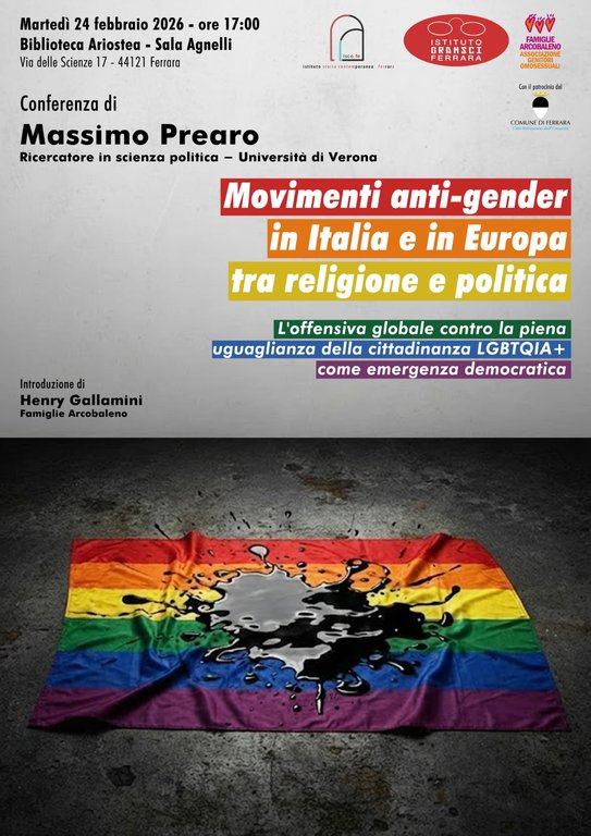 Martedì 24 febbraio 2026 alle ore 17, presso la Biblioteca Comunale Ariostea di Ferrara, si terrà l’incontro “Movimenti anti-gender in Italia e in Europa tra religione e politica. L’offensiva globale contro la piena uguaglianza della cittadinanza LGBTIQIA+ come emergenza democratica”, conferenza del politologo Massimo Prearo.