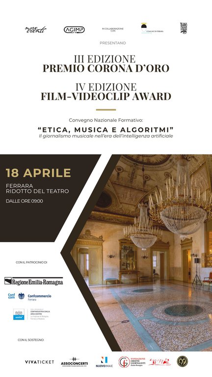 Sabato 18 aprile 2026, il Ridotto del Teatro Comunale ospita la III edizione del Premio Corona d’Oro e la IV edizione del Film-Videoclip Award all'interno del convegno formativo deontologico “Etica, musica e algoritmi — Il giornalismo musicale nell’era dell’intelligenza artificiale”. Tra i premiati e gli ospiti: Gino Castaldo, Mauro Repetto e i vertici dell’informazione musicale italiana. A seguire i casting della 58^ edizione di “Una Voce per L'Europa”presso Sala Prove 2.
