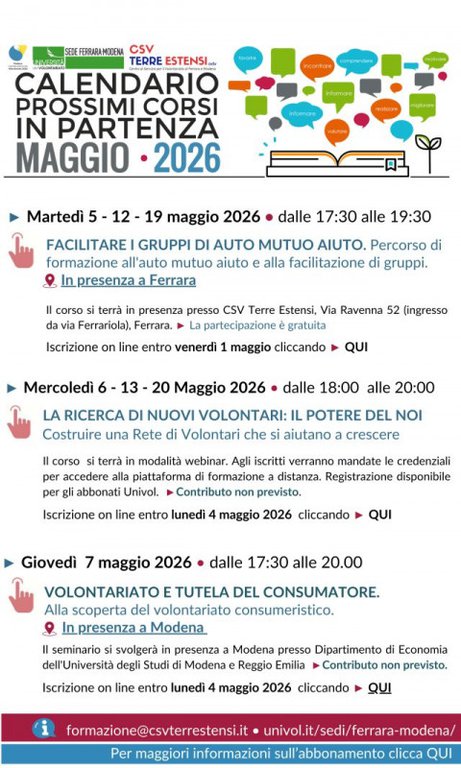 Il corso si terrà in presenza presso CSV Terre Estensi, Via Ravenna 52 (ingresso da via Ferrariola), Ferrara.