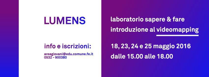 Da mercoledì 18 maggio comincerà “Lumens”, il primo workshop di video mapping organizzato a Ferrara dal centro Giovani. Di cosa si tratta? Non tutti conoscono la parola video mapping ma sicuramente tutti conoscono questa tecnica, perché hanno visto uno spettacolo dal vivo, su internet o in televisione. È una tecnica di proiezione che negli ultimi anni si è diffusa sempre di più, consiste nel creare illusioni ottiche trasformando in un display dinamico le superfici dello spazio urbano – facciate di palazzi, ponti, torri, mura storiche.