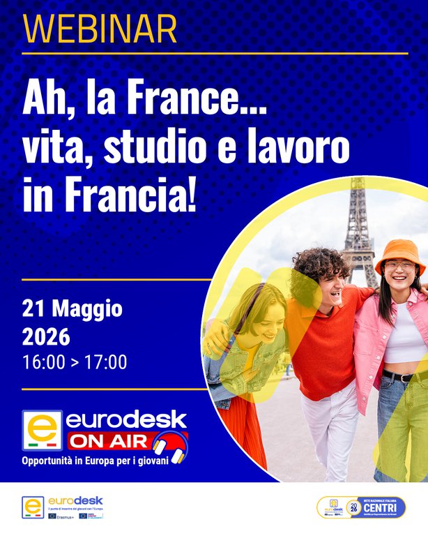 Il prossimo appuntamento si terrà giovedì 21 maggio, ore 16:00>17:00 sul tema “Ah, la France... vita, studio e lavoro in Francia!” ed è organizzato in collaborazione con il Centro Eurodesk di Bordeaux attivo presso il Centro Regionale di Informazione per i Giovani della Nuova Aquitania, in Francia.