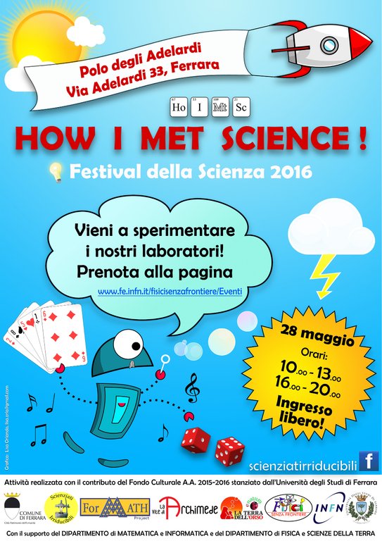 Appuntamento con la scienza sabato 28 maggio, dalle 10 alle 13 e dalle 16 alle 20, al Polo Adelardi (via Adelardi, 33), per la seconda edizione del Festival How I met Science!, organizzato da Scienziati irriducibili e Fisici senza frontiere, gruppi divulgativi di giovani studenti e ricercatori dell’Università di Ferrara, grazie al contributo del Fondo Culturale d’Ateneo 2015/2016.