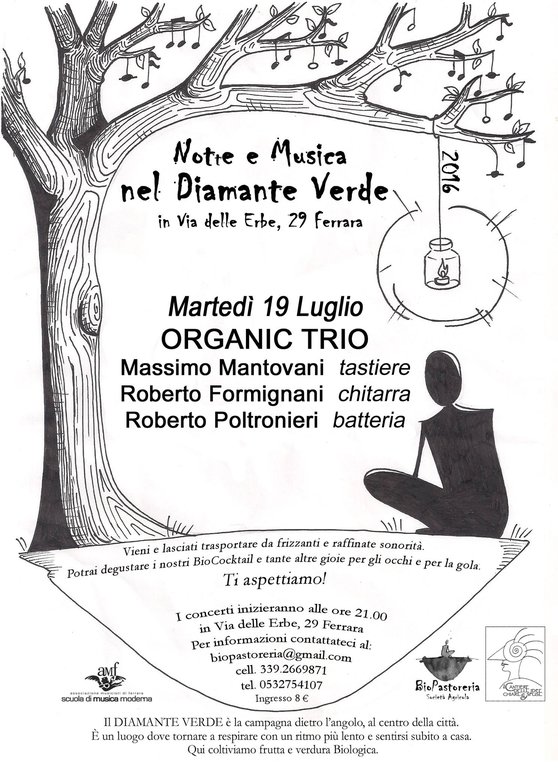 Martedì 19 luglio ore 21,00 ORGANIC TRIO Notte e Musica nel Diamante Verde in via delle Erbe 29 Ferrara.