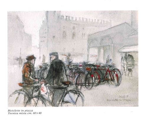 (immagine elaborata in proprio: Giovanni Cappelli, Biciclette in piazza (tecnica mista), in "Un diario ferrarese per immagini")