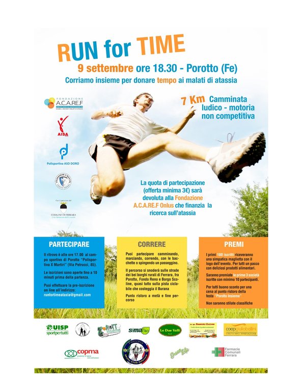 La fondazione ACAREF Onlus organizza giorno 9 settembre alle ore 18:30: "Run for time", una camminata ludico motoria a scopo benefico che si terrà presso la festa Porottoinsieme 2016.