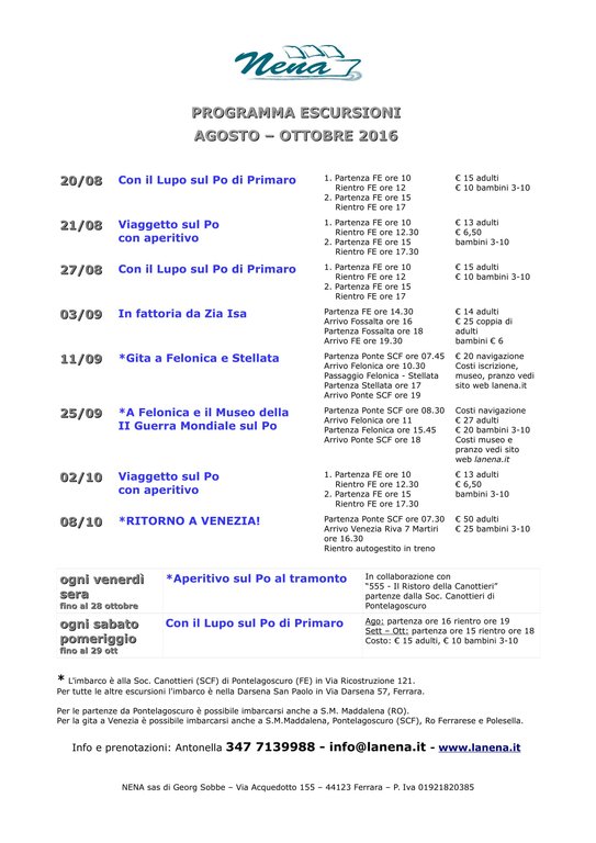 Consultabile sul sito www.lanena.it le iniziative e le escursioni in battello nei mesi da Agosto ad Ottobre 2016.