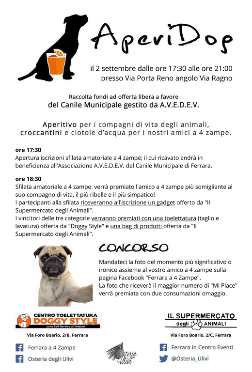 La sfilata ad offerta libera è a favore di A.V.E.D.E.V che gestisce il canile municipale, ad ogni partecipante verrà offerto un simpatico omaggio. L'iscrizione sarà possibile a partire dalle ore 17,00, avrà luogo in Via Porta Reno Angolo Via Ragno.