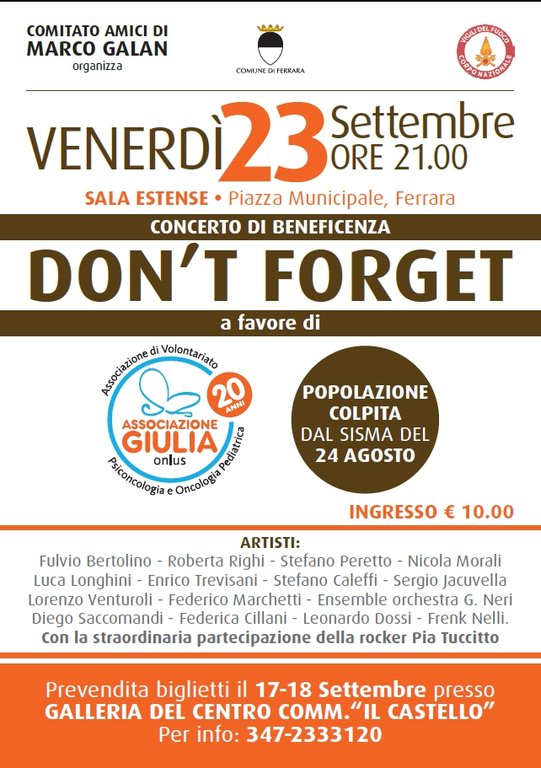 Venerdì 23 settembre sarà la Sala Estense a ospitare il concerto di beneficenza ‘Don't forget' a favore dei progetti dell'Associazione Giulia onlus e dei terremotati del centro Italia.