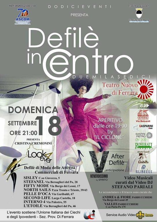 Per il confezionamento dell'evento, la Dodicieventi si avvale come sempre di partner del territorio. Giulietta Show Room di c.so Giovecca per l'allestimento di palco e fondale con tessuti pregiati dell'Azienda RUBELLI, conosciuta in tutto il mondo per il grande pregio dei suoi tessuti. L'arredo illuminotecnico è curato dall'Azienda SANTINI PIETRO Outdoor, appena trasferito in via Bagaro 11. La parte verde sarà curata con il solito stile da ROVERATI GIARDINI di Dogato in provincia di Ferrara. La Sfilata è assicurata dall'AGENZIA GENERALI di via Baluardi, azienda sempre molto presente sul nostro territorio e attenta alla promozione della nostra città.Sponsor ormai inossidabile di Dodicieventi, Gasparini Auto, che per l'occasione promuoverà il Marchio FIAT, LANCIA, ALFA ROMEO, JEEP.Per il service Audio/luci, come sempre Suono e Immagine.