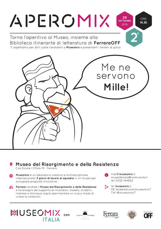 Giovedì 29 settembre alle 19.30, nella sede del museo in corso Ercole I d'Este 19, studenti, ricercatori e professionisti sono chiamati a partecipare attivamente, e sarebbe una conquista se in mille partecipassero al secondo aperomix ferrarese, l'aperitivo di Museomix.