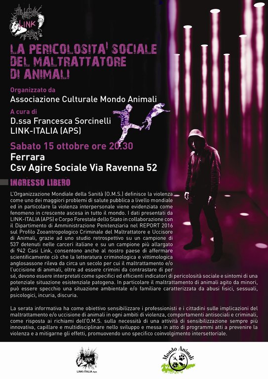 A seguito di alcuni recenti fatti di cronaca a Ferrara e provincia abbiamo deciso di organizzare in compagnia della Dott.ssa FRANCESCA SORCINELLI una serata informativa, che ha come obiettivo sensibilizzare i professionisti ed i cittadini sulle implicazioni del maltrattamento e/o uccisione di animali in ogni ambiti di violenza, comportamenti antisociali e criminali, come risposta ai richiami dell’Organizzazione Mondiale della Sanità (O.M.S).