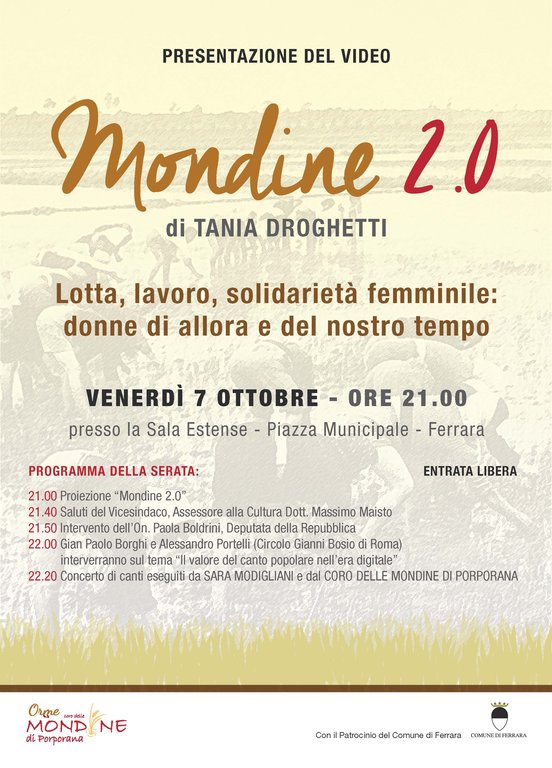 Venerdì 7 ottobre 2016 alle 21 in Sala estense (piazza Municipale) verrà presentato il video "Mondine 2.0" di Tania Droghetti in un incontro dedicato a "Lotta, lavoro, solidarietà femminile: donne di allora e del nostro tempo" con il patrocinio del Comune di Ferrara. L'ingresso è libero.
