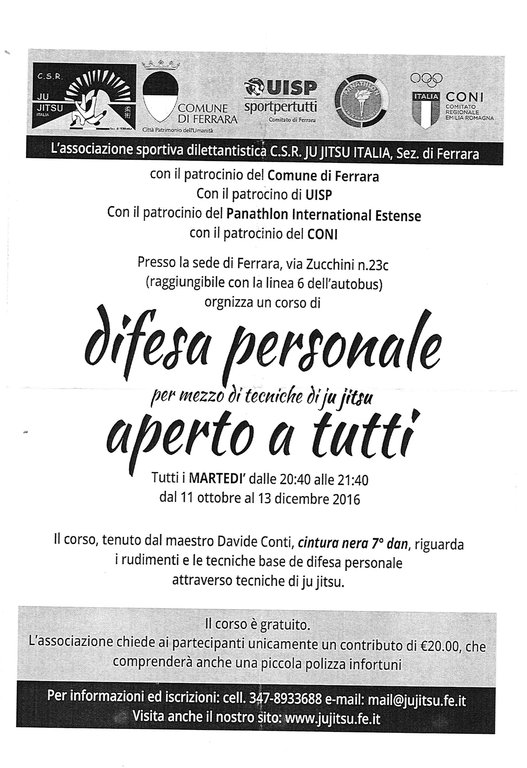 La sezione di Ferrara dell'associazione sportiva dilettantistica C.S.R. Ju Jitsu Italia, con il patrocinio del Comune di Ferrara, di Coni e Uisp e del Panathlon International Estense, ha organizzato nella sede di via Zucchini 23c (linea 6 dell'autobus) un corso di difesa personale aperto a tutti.